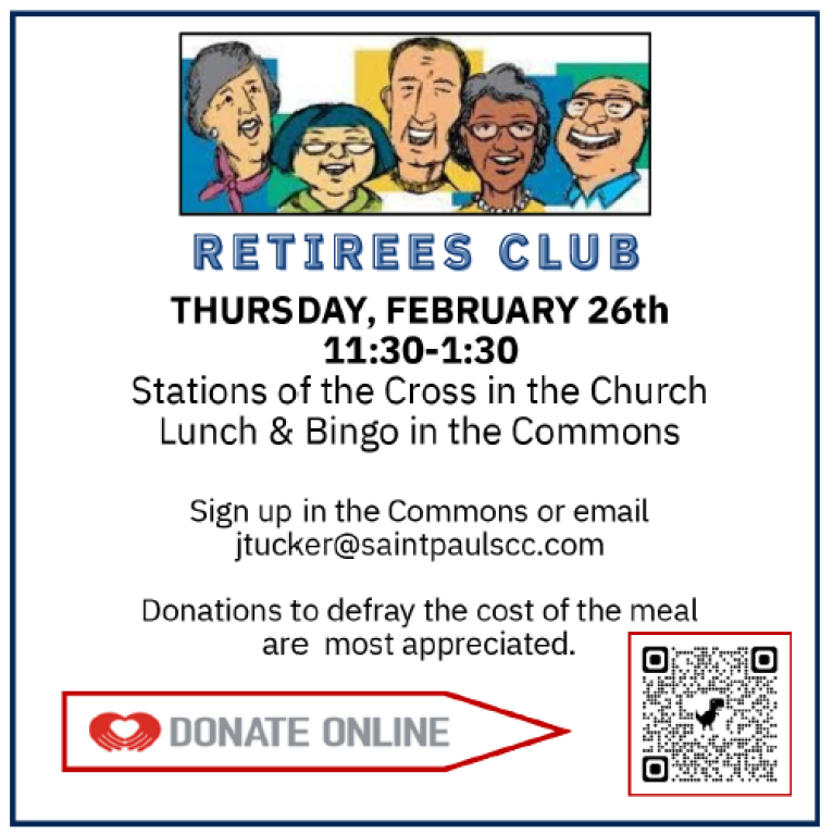 - Retirees Club: February 26th, 11:30am to 1:30pm (Stations, Lunch & Bingo)