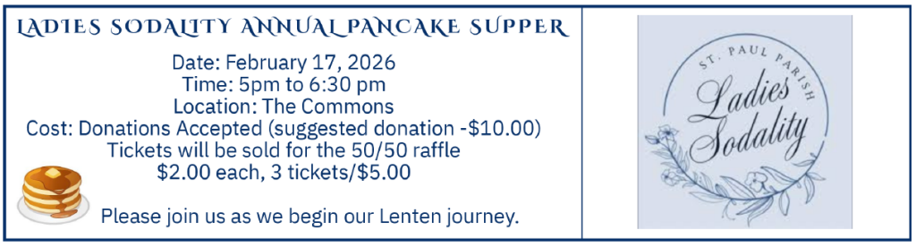 - Adult Formation: February 14th, 9am to 10:30am in Commons
