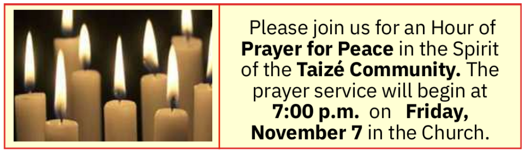 - Taizé- Hour of Prayer for Peace: November 7th, 7pm, in the Church
