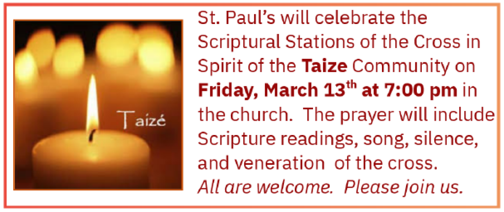 - Taize: March 13th, 7pm - Scriptual Stations of the Cross
