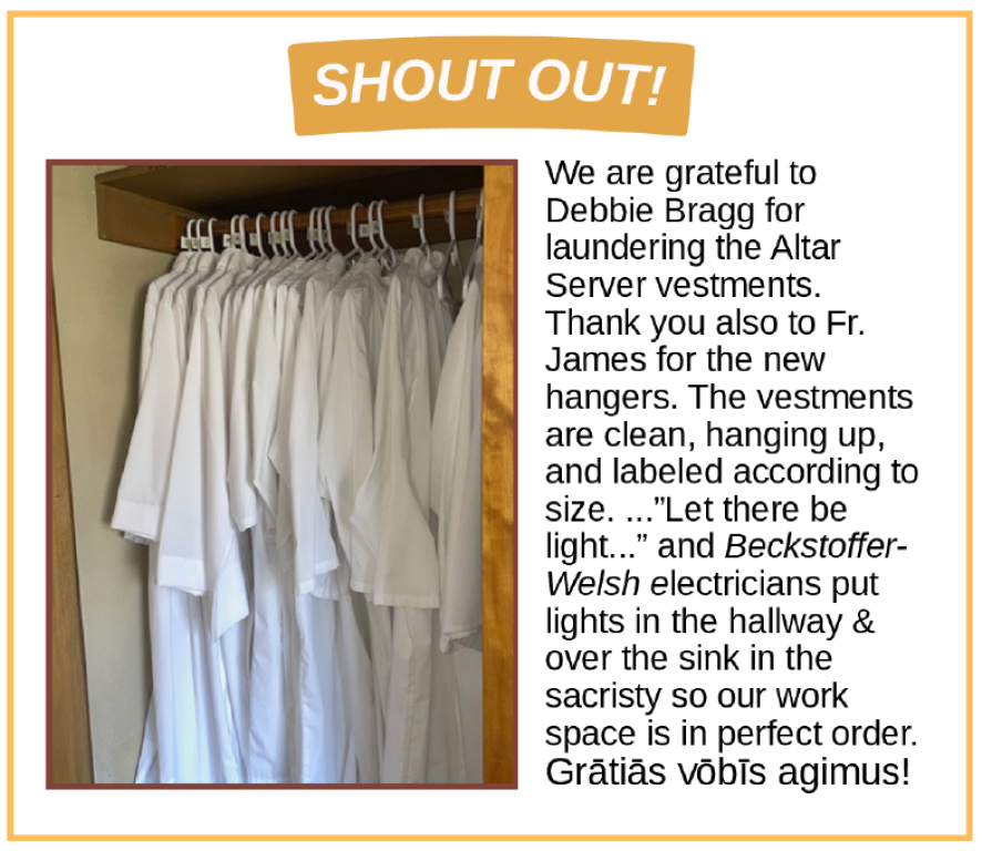 - Shout Out: Thank you Debbie Bragg for laundering Alter Server vestments