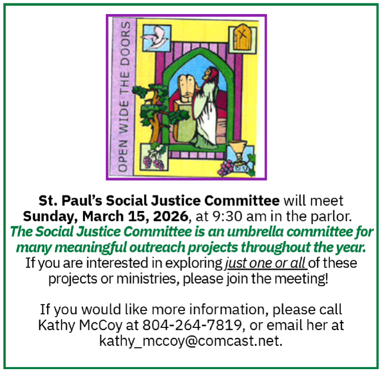 - Social Justice: March 15th, 9:30am in Parlor
